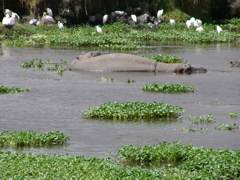kommen wir zu einem Wasserloch, in dem eine Gruppe Hippos vor sich hin döst.